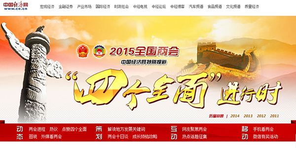 截图为中国经济网以“‘四个全面’进行时”作为其两会专题的主体。