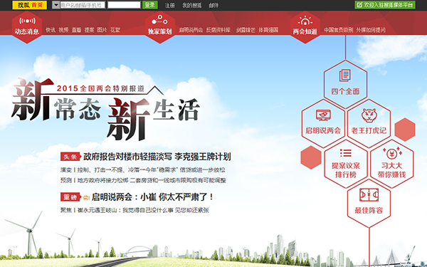 另外,搜狐网在其两会专题banner上嵌入了其制作的“四个全面”专题链接,作为搜狐网两会专题的报道重点,展示在页面的右上方,设计新颖,巧妙,重点突出,让人耳目一新。