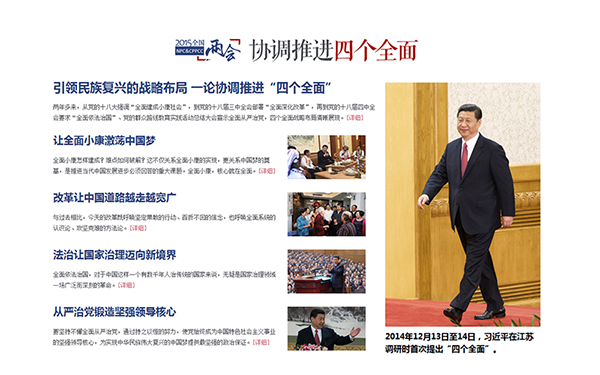 而中国日报中文网也在其两会专题中加入了“协调推进四个方面”的版块。其中,集纳了各个媒体网站发布的关于“四个全面”的分析评论稿件,与其两会专题完美融合。