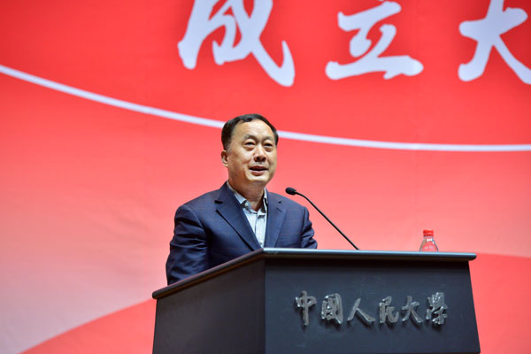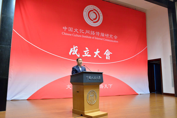 2015年4月29日,中国文化网络传播研究会成立大会在北京中国人民大学国学馆隆重举行。图为国家互联网信息办公室副主任任贤良致辞。新华网 郭小天 摄