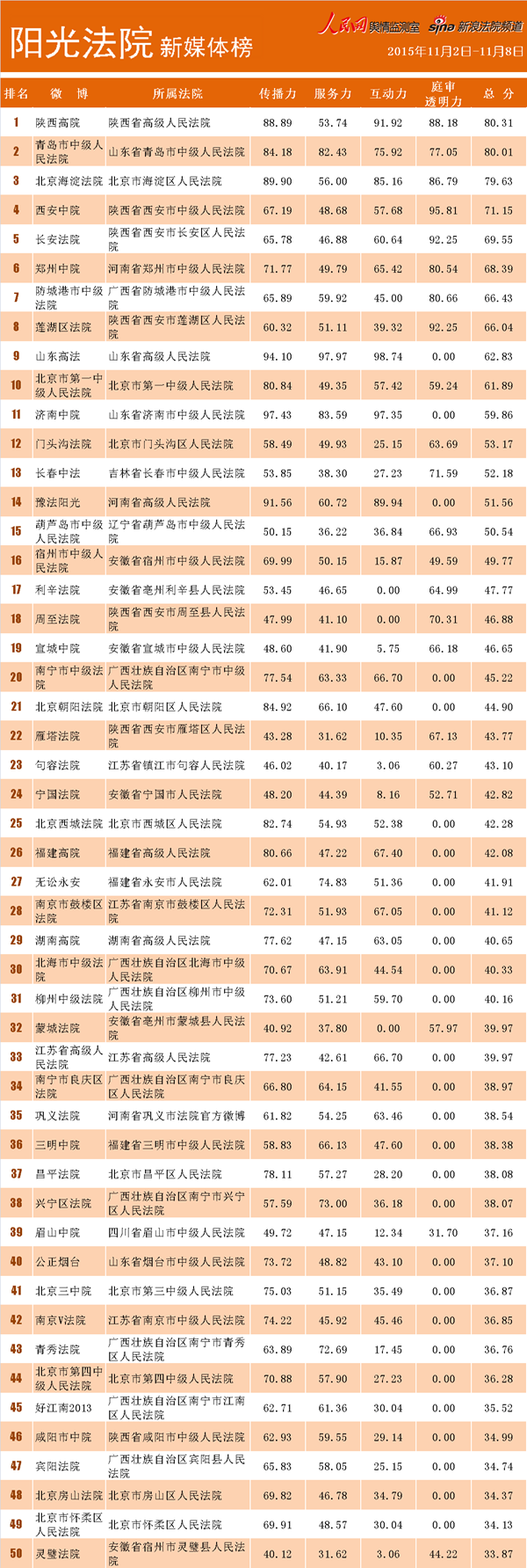 人民网舆情监测室与新浪法院频道通过科学的数据模型,监测全国范围内各级人民法院微博的传播、服务、互动能力,关注法院庭审透明度,联合推出“阳光法院新媒体榜”。本榜单旨在评估各地阳光法院的新媒体建设成果,为促进法院做好“互联网+”环境下新媒体司法公开宣传工作,协助法院构建“法院信息化3.0”体系中“开放、动态、透明、便民”的阳光法院平台发挥积极作用。