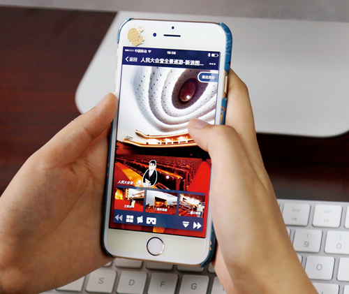 新浪网用H5+VR(虚拟现实)打造《人民大会堂全景巡游》,用户可自行切换角度场景,“亲临其境”感受现场。图/本刊记者潘树琼摄