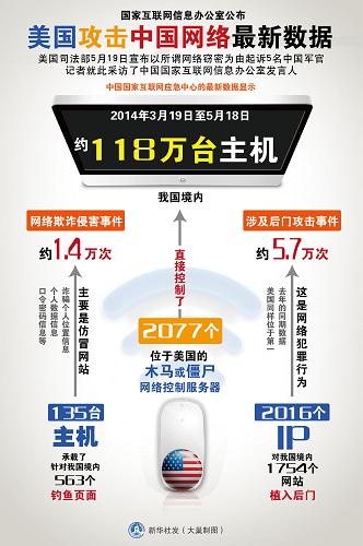 美国司法部5月19日宣布以所谓网络窃密为由起诉5名中国军官,记者就此采访了中国国家互联网信息办公室发言人。这位发言人向记者公布了美国攻击中国网络的最新数据,他说,美国才是当今世界上最大的网络窃密者,也是中国网络的头号攻击国。