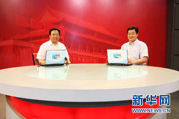 中国科协党组成员、书记处书记徐延豪与新华网总裁田舒斌进行友好交流。新华网 贾振 摄