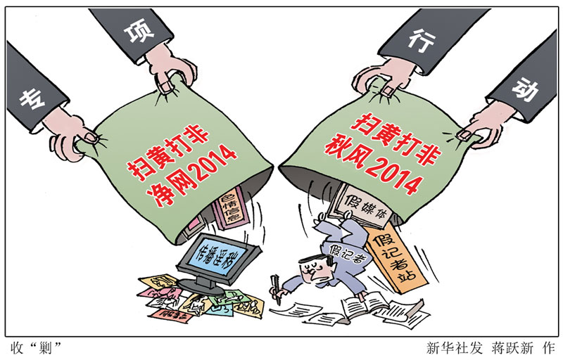 回顾2014年,“扫黄打非·净网2014”“扫黄打非·秋风2014”专项行动开展以来,有关部门严厉打击网络淫秽色情信息和假媒体、假记者站、假记者,取得良好效果。