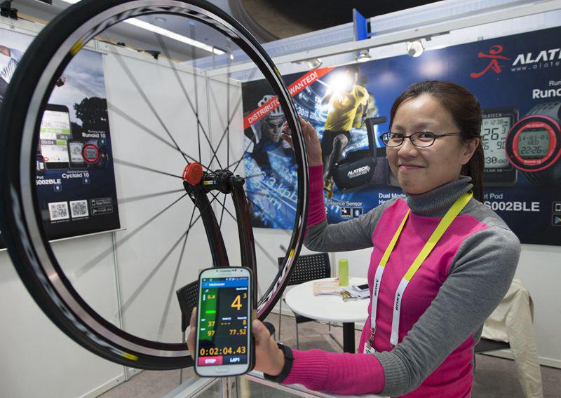 2015年1月6日,在美国拉斯韦加斯举行的2015国际消费电子展上,一家企业展示一款安装在自行车上的运动传感器。该装置可通过手机蓝牙同步运动数据。 2015国际消费电子展设立了中国专区,数十家中国小微企业入驻。中国小型电子产品精致实用,科技含量高,受到众多观展者欢迎。新华社记者杨磊摄
