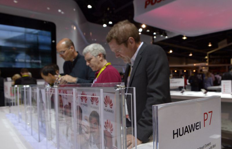 2015年1月6日,在美国拉斯韦加斯举行的2015年国际消费电子展上,参观者观看华为公司的产品。 2015年拉斯韦加斯国际消费电子展当日开幕,有超过1000家中国企业参加此次展会。 新华社记者 殷博古 摄