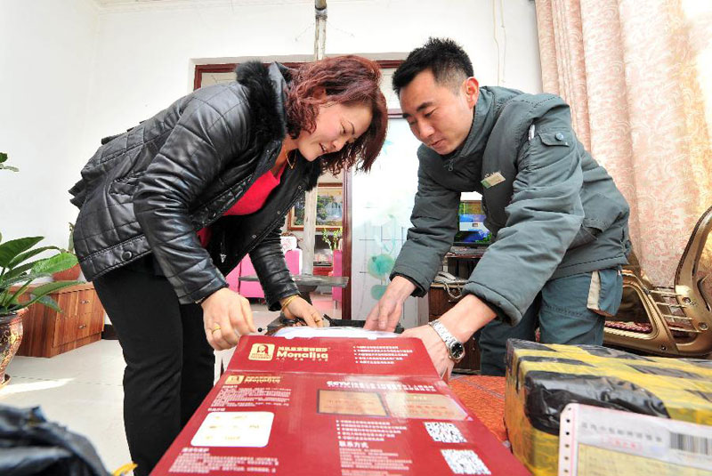 在宁夏吴忠市利通区杨马湖村,李祥在村民家中为网购的村民打开包裹查验是否有损坏,这些服务工作是他每天必须做的(1月8日摄)。近年来,随着我国电子商务的不断发展,网购不再是城市人的专利,庞大的农村市场正在悄然觉醒。长期以来,无论是京东等类型的自建物流,还是“四通一达”等快递公司,运输路线往往难以深入村级市场。近日,记者在宁夏回族自治区吴忠市跟踪采访了一位专门负责向当地农村网购人群递送包裹的快递员,用镜头记录下了这位奔走在农村网购最后“一公里”路上投递员的辛勤身影。今年28岁的李祥是宁夏邮政公司吴忠分公司的一位普通投递员,公司让他负责周边几个村庄的包裹递送和揽收,很多其他物流企业的包裹也要转接到他这下乡递送。每天,李祥都要骑摩托带上几十公斤重的包裹长途跋涉,下乡送件,一天就要送60多件,高峰期能突破一百件。 “很多村都是一个人负责帮很多村民网购,我不仅要把包裹送到,还要做好这些网购达人的服务工作,有时候一个村就要呆上一个多小时。”李祥告诉记者,下乡递送虽然辛苦,但也很有意思,“有一次递送完包裹,村民们都出来笑着跟我招手送我,那场面让我挺有成就感的!” 新华社记者 彭昭之 摄