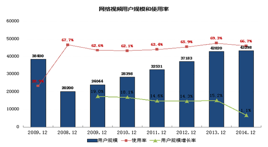 截至2014年12月,中国网络视频用户规模达4.33亿,较去年年底增加478万人,用户增长率为1.1%,整体规模仍在增长,但增长率已明显放缓。网络视频用户使用率为66.7%,近五年来首次下降。网络视频对新增网民的拉动作用减弱,行业步入平稳发展期。