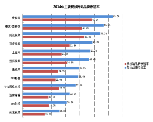 2014年,中国视频网站的格局基本稳定:过去半年内使用过网络视频的用户中,63%的用户使用过优酷网,排在首位;奇艺/爱奇艺、腾讯视频的品牌覆盖率都在55%左右,分列第二、三位;百度视频凭借自身平台的优势和海量用户的基础,与多家版权内容方合作,成为多家视频网站的流量入口,其品牌覆盖率达48.8%,排在第四位;土豆网、搜狐视频等有自身特色的视频网站的覆盖率也都在40%以上。