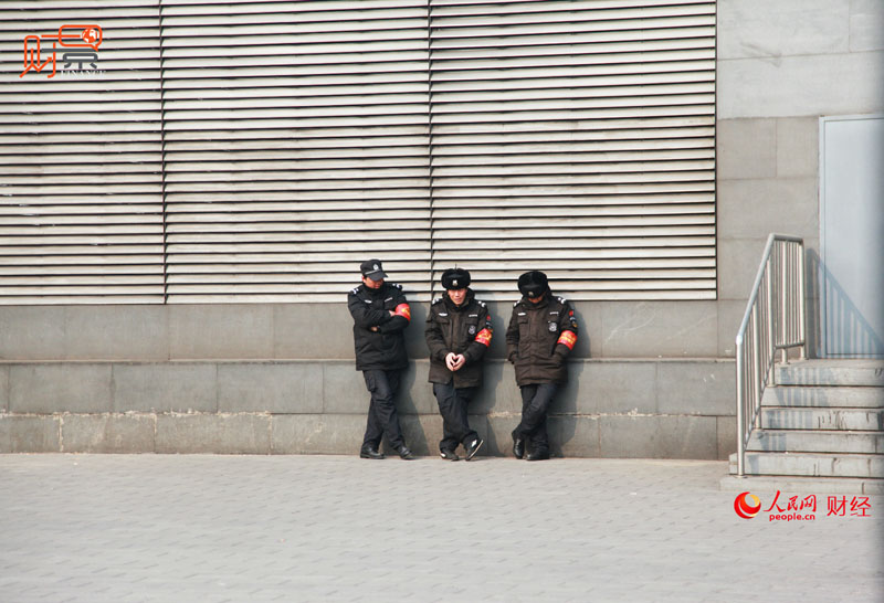 下午15点,国家图书馆,正在晒太阳的城管。月薪2000多元,他们来自外地,工作从早6点到晚9点,每天3班倒。 难得悠闲,他们站在阳光下聊天,晒太阳。