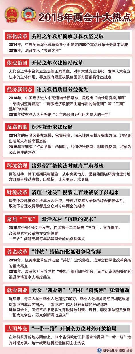 新华网北京3月1日电(记者 乌梦达、叶前、崔清新)进入倒计时的全国两会,无疑是在一个历史性的节点召开——2015年被定位为“全面深化改革关键之年”“全面推进依法治国开局之年”“全面完成‘十二五’规划收官之年”等3个“之年”。