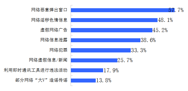 2015年1月底,国内知名民调公司零点调查开展了一项网络生态环境的调查,对党的十八大以来国内网络生态环境的各方面变化情况进行了系统调查。调查显示,网民目前上网最厌恶的网络有害信息和侵权行为是“网络恶意弹出窗口(57.7%),比例接近6成。其次是“网络淫秽色情信息”和“虚假网络广告”,分别有48.1%和45.2%的入选比例。另有两种网络有害信息和侵权行为的入选比例超过了3成,分别是:“网络信息泄露”(38.6%)、“网络犯罪”(33.3%)。
