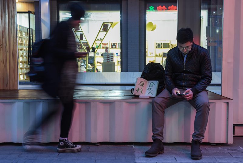 1984年出生的赵轶潇(右)在中关村创业大街的长凳上摆出写有“寻找合伙人”的笔记本,静候有人前来洽谈(3月13日摄)。