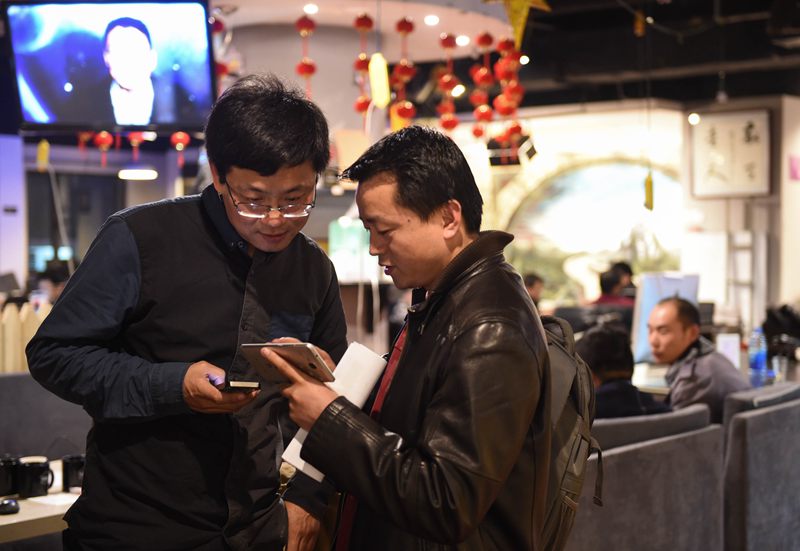 两位素不相识的人在中关村创业大街车库咖啡因为对某一个项目产生兴趣,通过互加微信建立联系(3月13日摄)。