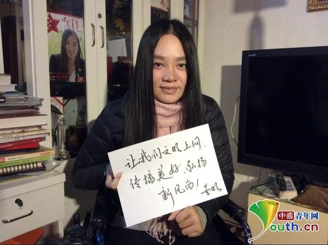 “让我们文明上网,传播美好,弘扬新风尚!”全国道德模范、中国青年五四奖章获得者、武汉市青年委员、轮椅上的微笑天使董明在谈到清朗网络时说。 董明供图