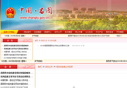 4、辽宁省铁岭市昌图县政府网站:“政务公开”内包括“县政务信息公开指南”、“县政府信息公开目录”等几项政务公开栏信息均为空白。“统计信息”一栏也仅有一条2011年9月14日发布的消息,内容为“2010年昌图县国民经济和社会发展统计公报”。