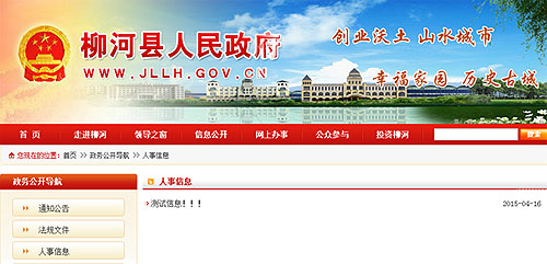 5、吉林省通化市柳河县政府网站:“人事信息”一栏中,除了2015年4月16日发布的“测试信息!!!”的消息,再无其他内容。