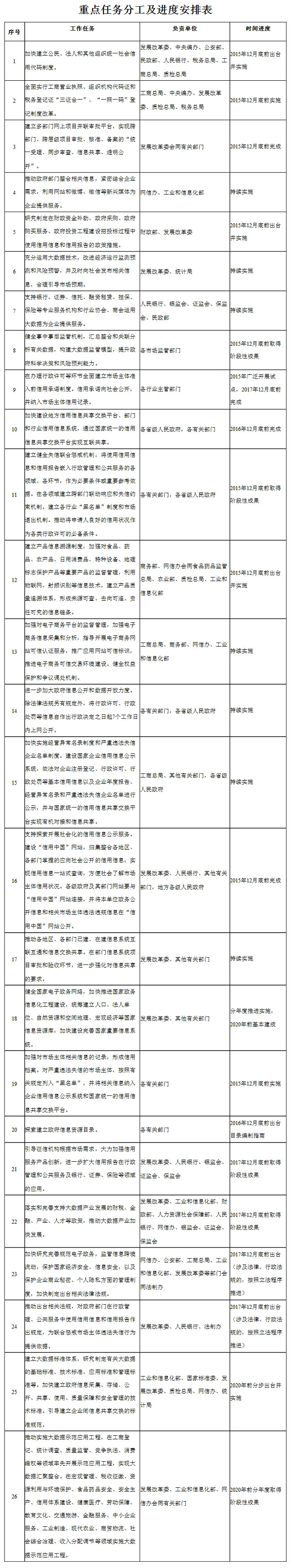 (十二)加快建立统一的信用信息共享交换平台。以社会信用信息系统先导工程为基础,充分发挥国家人口基础信息库、法人单位信息资源库的基础作用和企业信用信息公示系统的依托作用,建立国家统一的信用信息共享交换平台,整合金融、工商登记、税收缴纳、社保缴费、交通违法、安全生产、质量监管、统计调查等领域信用信息,实现各地区、各部门信用信息共建共享。具有市场监管职责的部门在履职过程中应准确采集市场主体信用记录,建立部门和行业信用信息系统,按要求纳入国家统一的信用信息共享交换平台。