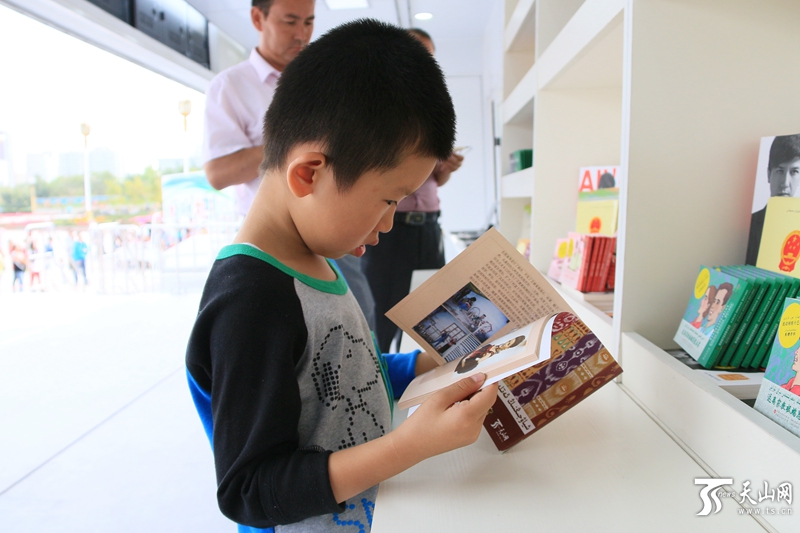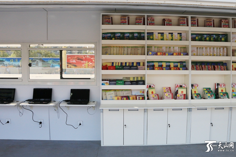 在“流动网络大巴扎”车上市民可以上网功能和阅览图书。