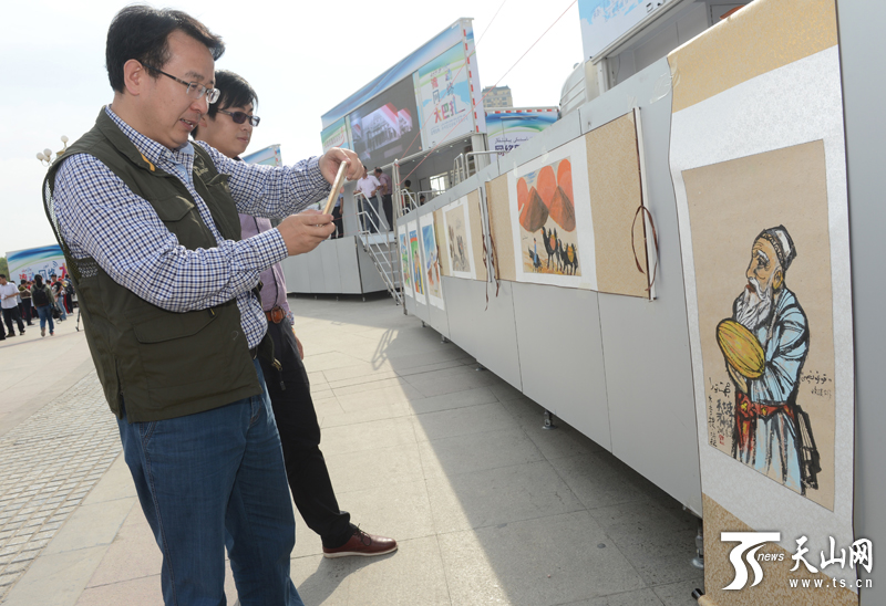 市民关注“流动网络大巴扎”,现场观赏展出的农民画。