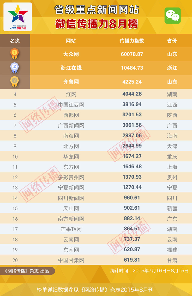 省级重点新闻网站 微信传播力8月榜