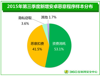 与此同时,新增恶意程序的类型也较为稳定。360互联网安全中心在2015年第三季度监测到的安卓平台恶意程序中,资费消耗类的新增恶意程序超过半数,占新增恶意程序的53.1%,与恶意扣费(41.5%)和隐私窃取(3.6%)成为最主要的新增恶意程序类型。