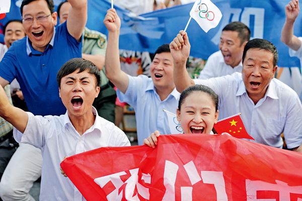 2015年7月31日,北京携手张家口成功申办2022年冬季奥运会的消息从吉隆坡传来,河北省张家口一片欢腾,人们激情起舞、敲锣打鼓,以不同形式进行庆祝。供图/CFP