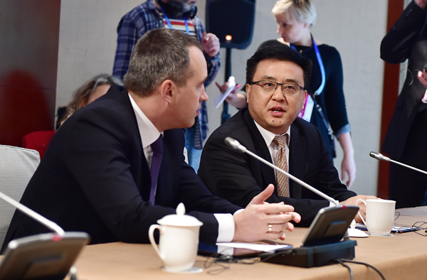 12月16日,第二届世界互联网大会期间,在俄罗斯总理梅德韦杰夫牵头下,中俄互联网企业家展开风云对话,共商合作良机。图为百度公司总裁张亚勤与俄方代表交流。