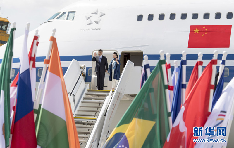 7月6日,国家主席习近平乘专机抵达德国汉堡,出席二十国集团领导人第十二次峰会。这是习近平和夫人彭丽媛步出舱门。 新华社记者 李学仁 摄