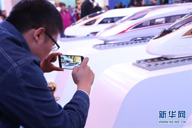 新华社照片,北京,2017年10月12日 向着梦想,奋进!——来自“砥砺奋进的五年”大型成就展现场的报道 10月12日,一名观众在“砥砺奋进的五年”大型成就展现场拍摄“复兴号”列车模型。新华社记者 张玉薇 摄