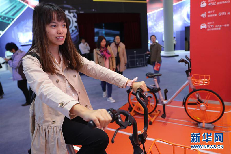 10月12日,一名观众在“砥砺奋进的五年”大型成就展上体验共享单车。新华社记者 张玉薇 摄