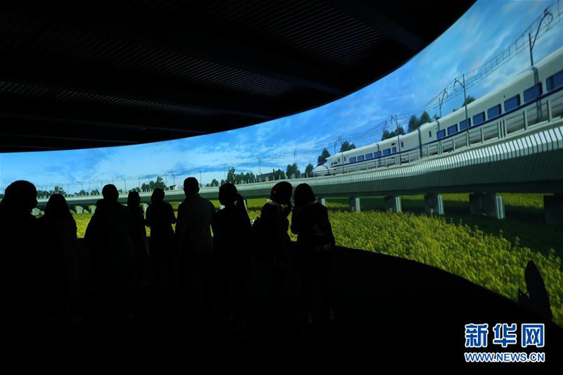 10月12日,观众在“砥砺奋进的五年”大型成就展上观看环幕影片。新华社记者 张玉薇 摄