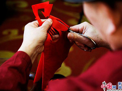 刚刚画好图样的红纸,在姚雨林的手中即将成为一幅窗花作品。中国网实习记者 张钰 摄