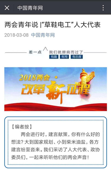 让代表们自己分模块讲述“我的两会名片”“我的家乡故事”“我的新使命”,我们推出的“两会青年说”系列图文作品迅速成了新“网红”,网友@一默微雨 希望智能化设施能让宁启水代表不再这么辛苦,留言说“现在都智能化了,很少见抄电表的了,相信这种情况很快就会改变。”网友@狗狗的秋心 留言说:“把一件事做到极致,就是伟大。致敬普通而伟大的技工。”