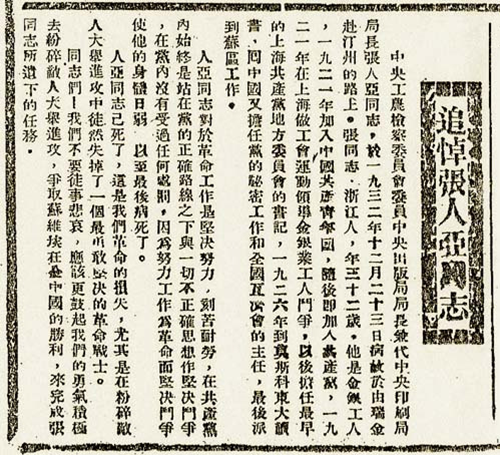 1933年1月7日《红色中华》报刊发《追悼张人亚同志》,图片来自党建网