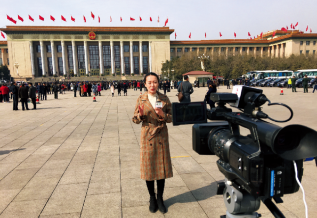 中国军网记者在人民大会堂前报道十三届全国人大一次会议开幕会。供图/中国军网