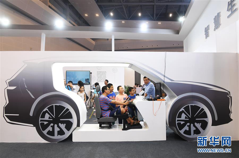 8月23日,观众在首届中国国际智能产业博览会上体验紫光车辆主动安全防御监控平台。