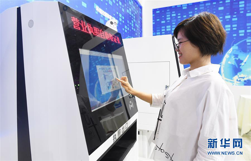8月23日,观众在首届中国国际智能产业博览会重庆江北馆体验“营业执照自助取证机”。