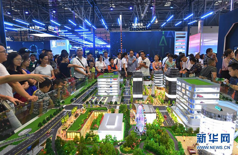 8月23日,观众在首届中国国际智能产业博览会上参观“城市智慧交通新生态”动态沙盘。
