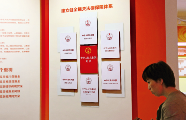 4月27日,北京世纪坛4·15全民国家安全教育日主题展览上展出了《宪法》《国家安全法》《反恐怖主义法》《网络安全法》等法律文献。供图/CFP