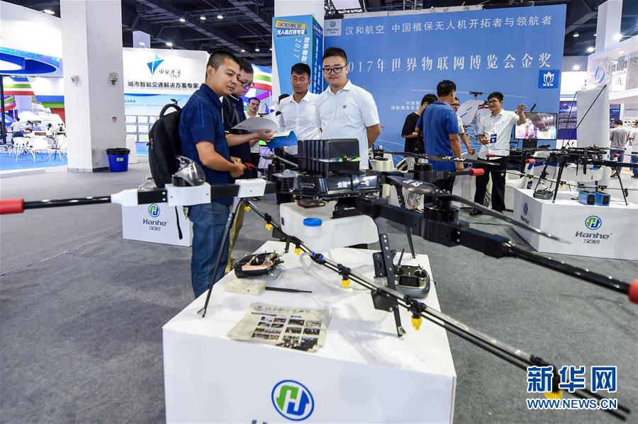 9月15日,观众在2018世界物联网博览会上参观农业无人机。新华社记者 李博 摄
