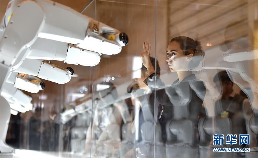 9月18日,一名与会者(右)与感知工业机器人互动。 当日,第十二届夏季达沃斯论坛(2018年世界经济论坛新领军者年会)在天津举行,会场上虚拟现实技术体验、感知工业机器人、数字技术运用等科技感十足的展示项目吸引了众多与会者参观体验。 新华社记者岳月伟摄