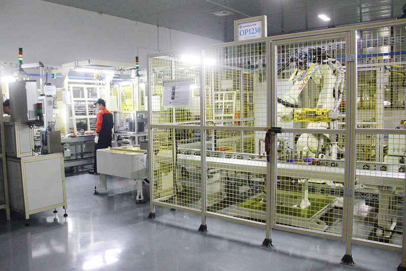 在轩孚自动变速器有限公司汽配车间,搬运机器人配合高精度拧紧枪或夹具,进行螺栓拧紧、托盘清理、工件搬运、工件翻转等工作,降低了人员劳动强度,提高了安装、搬运定位精度。(中国网信网 余甜甜摄)
