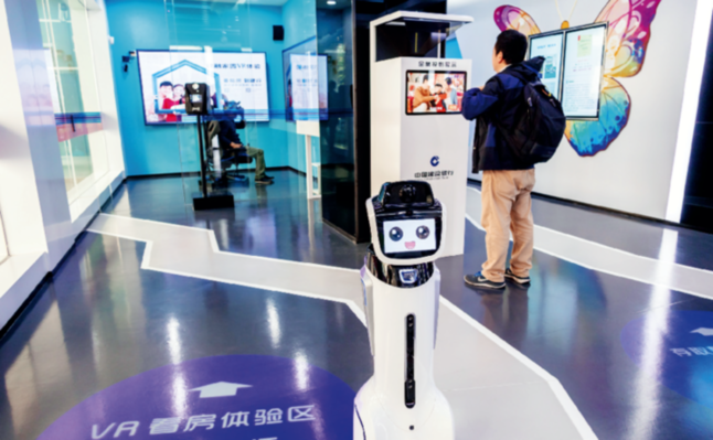 4月11日,上海,国内首家“无人银行”在建行九江路支行开业,“无人银行”内两位智能机器人取代了银行柜员及工作人员,市民通过身份证实名认证即可入内办理各种业务。供图/CFP
