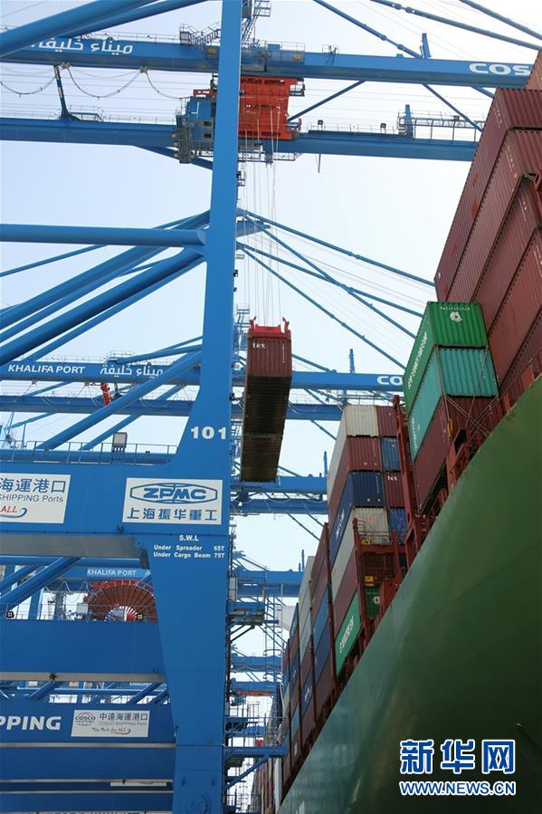 这是4月20日在阿联酋阿布扎比哈里发港拍摄的中远海运阿布扎比码头现场。 中国远洋海运集团有限公司下属中远海运港口有限公司与阿联酋阿布扎比港务局合资经营的阿布扎比哈里发港二期集装箱码头20日首次迎来大型集装箱船舶靠泊作业。 新华社记者 苏小坡 摄