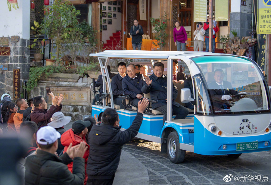 习近平总书记19日下午前往腾冲和顺古镇考察调研。他来到和顺图书馆,察看古丝路上崇文尚教的优良传统。他沿着古镇小巷步行,走进“大马帮博物馆”,详细了解西南丝路古道历史和近代以来腾冲对外交流史。沿途游客看到总书记,热情簇拥上来,习近平同他们亲切打招呼,询问大家都来自哪里?在七彩云南走了哪些地方?有游客问:“习大大,彭麻麻呢?”总书记笑着回答说:“没来。过年了都在家里忙着呢!”大家都会心笑了起来。古镇里暖意融融,笑声阵阵。(文字记者:张晓松、朱基钗 摄影记者:鞠鹏、谢环驰、燕雁)