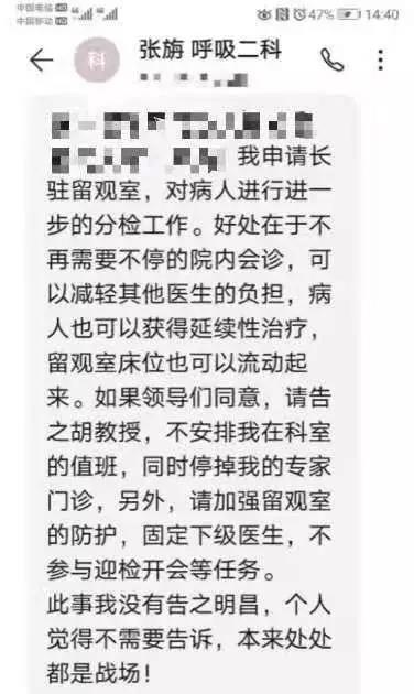 1月18日,张旃做出了长驻留观室的决定,她向医院领导写下请战书:“我申请长驻留观室,对病人进一步分检,这样可减轻其他医生负担,病人也可获得延续性治疗,留观室床位也可以流动起来。”