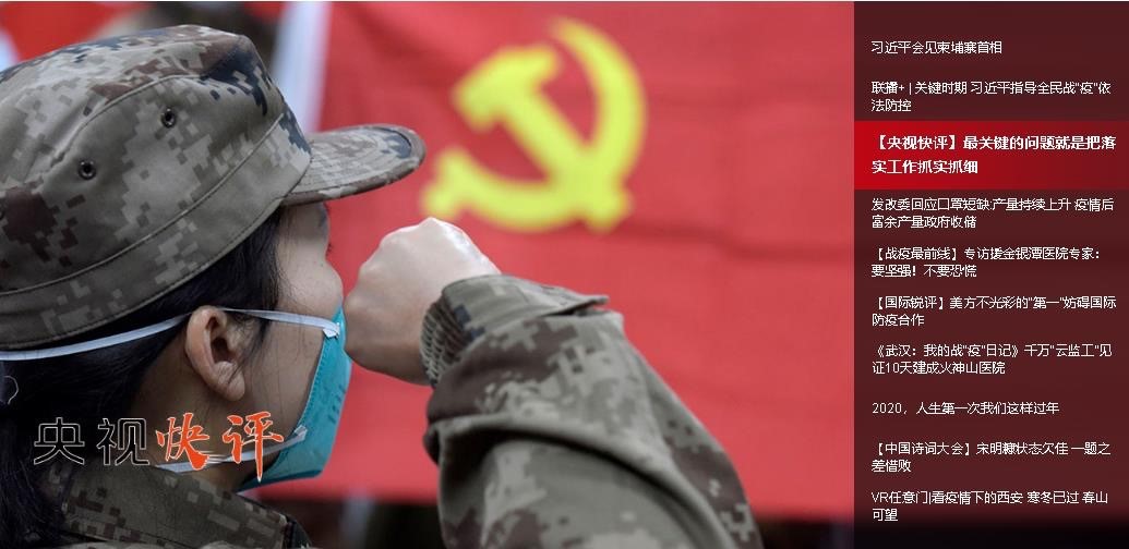 在此次抗击新冠病毒肺炎疫情报道中,央视网坚定履行中央重点新闻网站责任,秉持差异化传播思路,通过舆论引导、动态报道、社交互动和生活服务,全方位陪伴网民共同战“疫”。围绕中央精神、民众关切推出央视快评、联播+、央视网评等产品,做好舆论引导;以《战“疫”最前线》为主打,推出《抗疫一线报告》《每日疫情图》《共同战疫》《我和你》《够科普》《谣言必考卷》《慢直播》等系列产品,形成报道矩阵;推出视频彩铃、微信特色头像、创意海报等互联网特色交互产品,加油鼓劲;推出“宅”系列、云旅游、“患者同行程”查询、在线心理帮助等产品,为网友提供实用、特色服务。