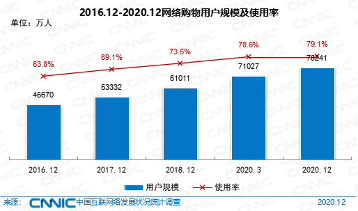 自2013年起,我国已连续八年成为全球最大的网络零售市场。2020年,我国网上零售额达11.76万亿元,较2019年增长10.9%。其中,实物商品网上零售额9.76万亿元,占社会消费品零售总额的24.9%。截至2020年12月,我国网络购物用户规模达7.82亿,较2020年3月增长7215万,占网民整体的79.1%。随着以国内大循环为主体、国内国际双循环的发展格局加快形成,网络零售不断培育消费市场新动能,通过助力消费“质”“量”双升级,推动消费“双循环”。在国内消费循环方面,网络零售激活城乡消费循环;在国际国内双循环方面,跨境电商发挥稳外贸作用。此外,网络直播成为“线上引流+实体消费”的数字经济新模式,实现蓬勃发展。直播电商成为广受用户喜爱的购物方式,66.2%的直播电商用户购买过直播商品。